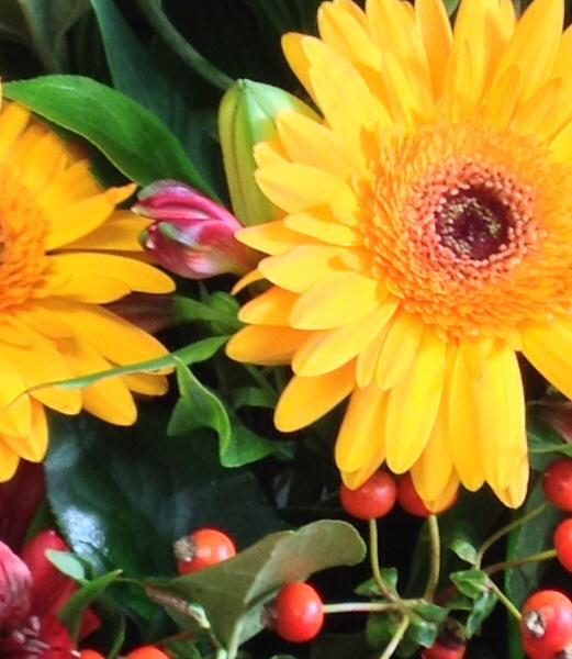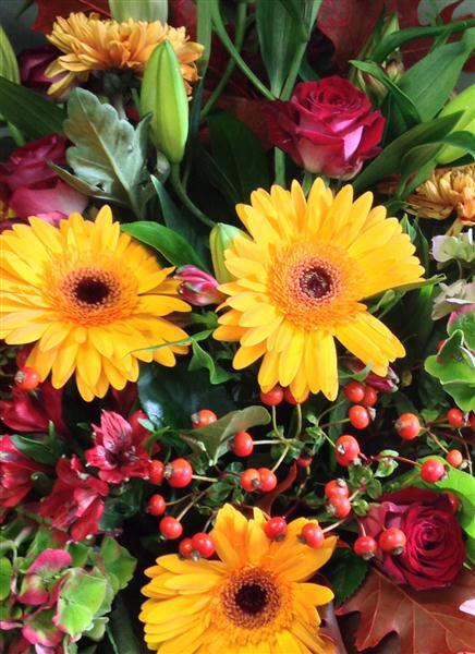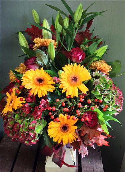 A stunning deep red and gold autumn bouquet including vibrant gerberas, roses, alstromeria and lilies combined with autumnal foliage.