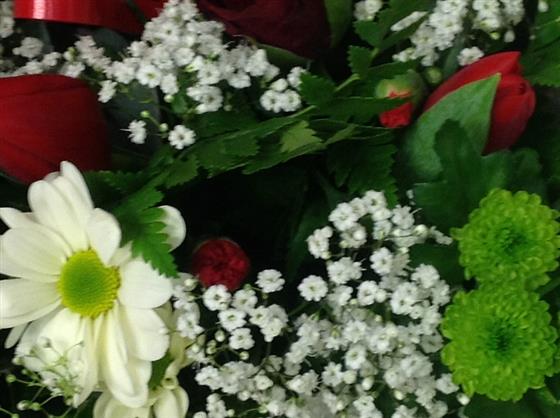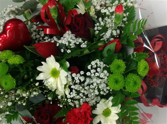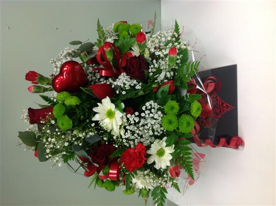 Valentine box arrangement includes red roses, spray carnations, chrysanthemums, gypsophila
