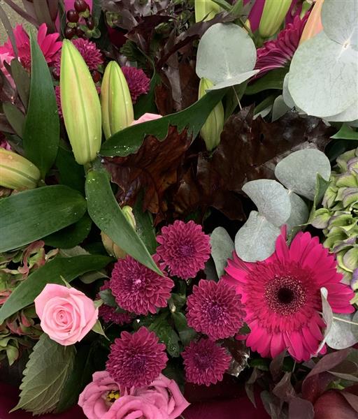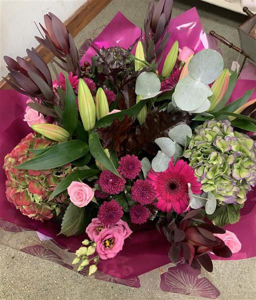A stylish design of premium lilies and hydrangeas in the darker pink shades.
