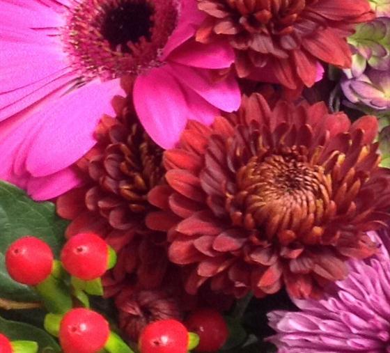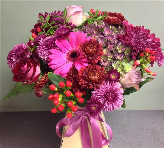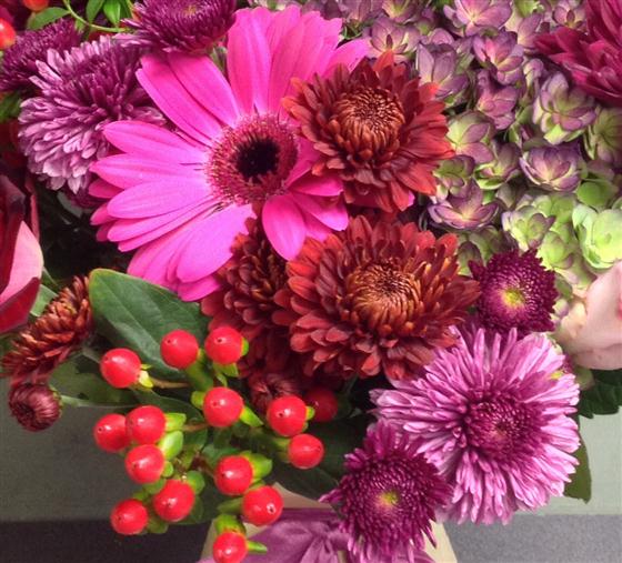 A glorious and striking array of mixed pink blooms in a variety of shades. Including roses, gerberas, roses and berries.