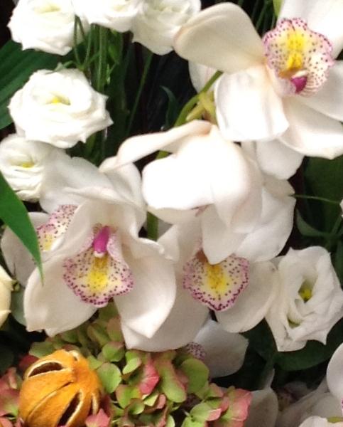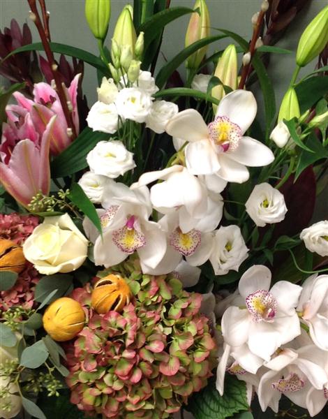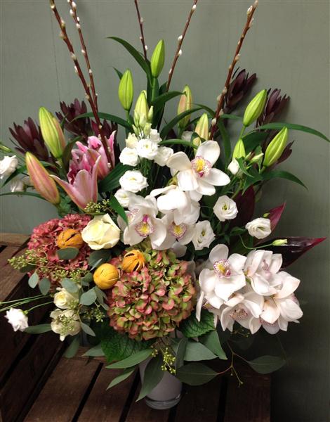 Large orchids, roses, lilies, hydrangeas and complimenting foliage create this show stopping display presented in a glass vase. A truly special gift.