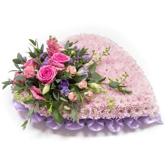 A feminine, heart shaped tribute created using a base of pink chrysanthemums with a delicate spray of lilacs and pinks including roses and larkspur.