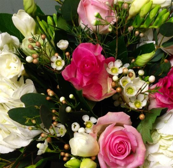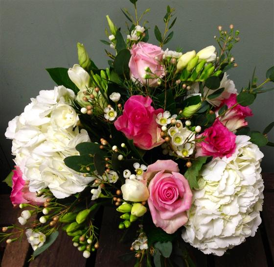 Delicate cream wax flower points to the sky out of this graceful display. Bold hydrangeas skirt the edge of pretty pink roses and scented cream freesias.