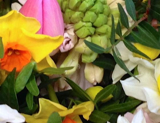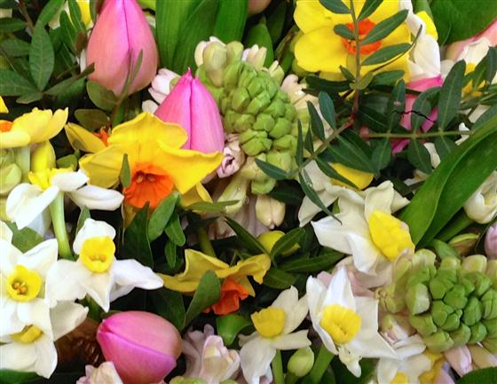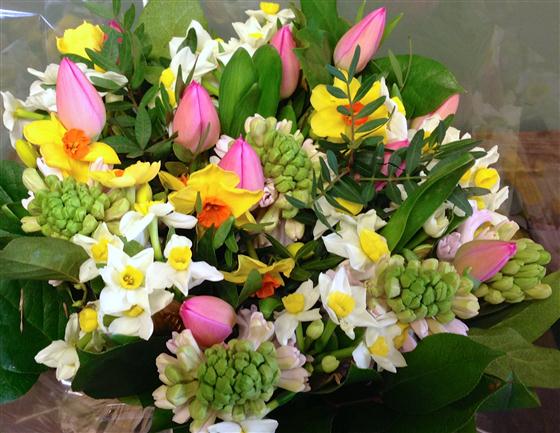 Spring is here, softer tones of tulips combine with heavily scented hyacinths and narcissus to create a delicate hand-tied bouquet.
