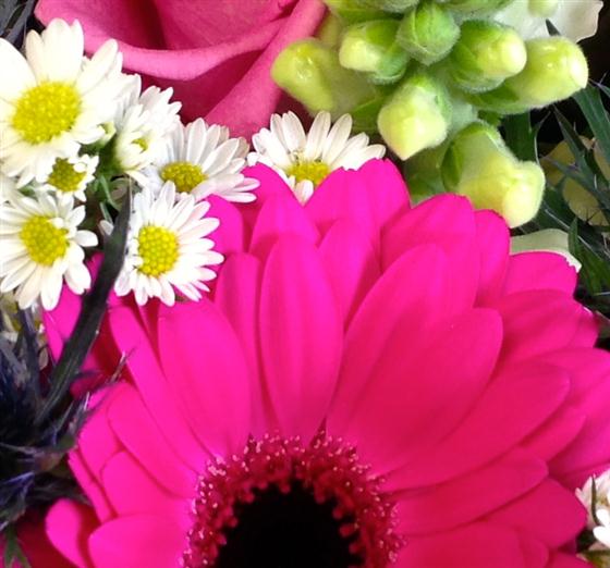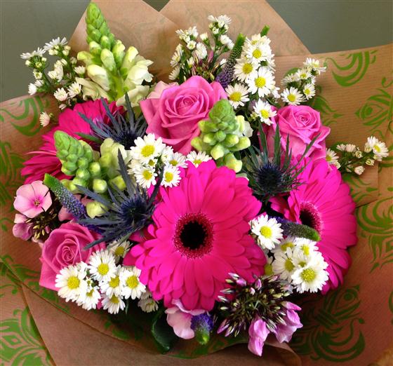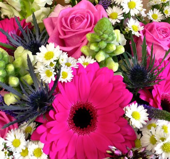 A delightful display of hot pink gerberas and roses mixed with asters, anthirriums, veronica and phlox.