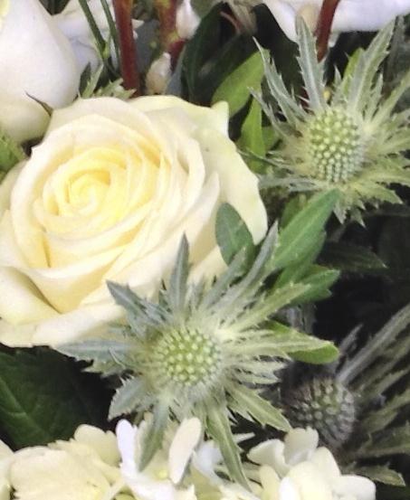 Wintery whites, chrysanthemums, roses and lisianthus help to create this crisp, seasonal bouquet.