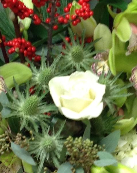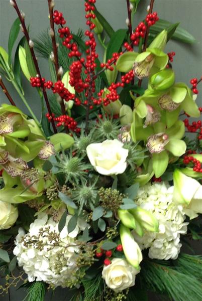 A truly magnificent display of stunning winter flowers presented in a glass vase. Orchids, lilies, roses, amaryllis, hydrangeas, berries and winter foliage are all included.