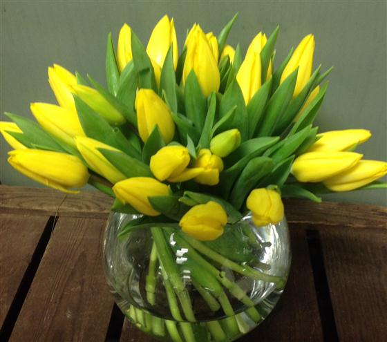 Vase of all yellow tulips. There is 30 best Dutch tulips in a glass fishbowl vase.
