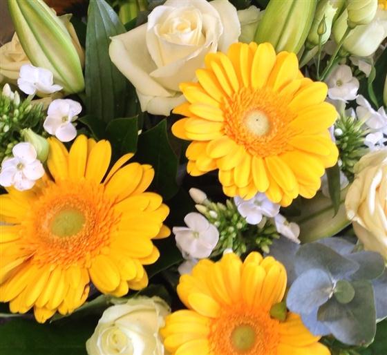 Bold yellow gerberas are the focal point of this dazzling bouquet including white roses, scented lilies, phlox and lisianthus.