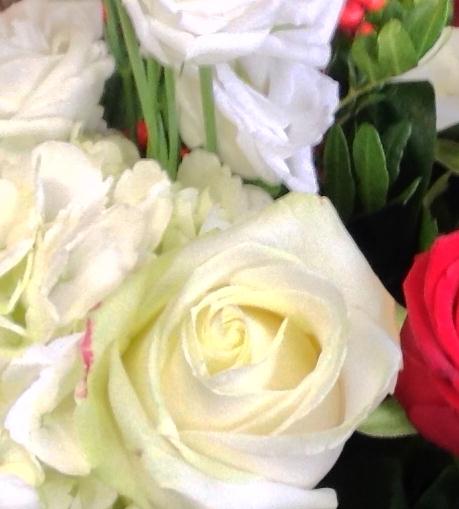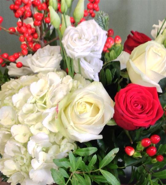 Ilex and hypericum berries, white and red roses, white lisianthus and winter foliage - a beautiful festive display.